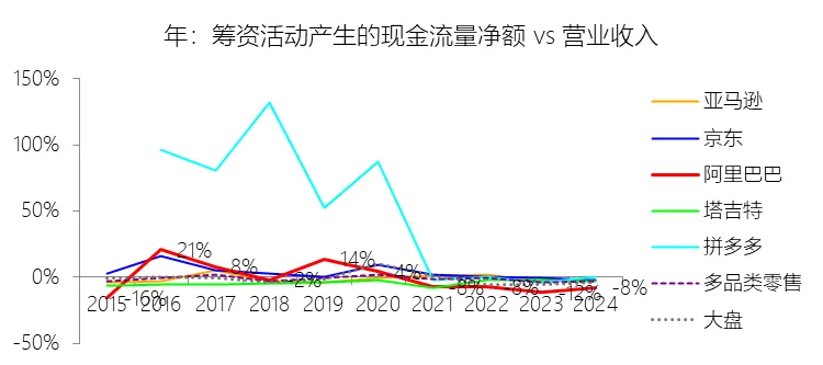 筹资活动产生的现金流量净额:2026财年中期,阿里巴巴的筹资活动产生的现金流量净额为11.50亿美元,与营业收入的比例为1.65%,同比上升19.65个百分点;2016-2025财年(十年),此项合计为-265.39亿美元,平均比例为-3.13%,比多品类零售行业的均值低1.82个百分点,长期呈下降趋势。**比例短期上升主要由于**公司在2026财年中期实施了显著的多元化融资与资本结构优化战略,期内通过发行**可转换高级票据**获得约29.49亿美元净流入,并发行了约15.43亿美元的**零息交换债券**,同时**新增借款**同比大幅增长68.72%,这些巨额的外源性资金注入有效抵冲了当期约47.23亿美元的股息支付及10.73亿美元的股份回购支出,使得筹资活动净现金流由负转正;此外,如前所述,由于同期营业收入增速放缓(仅1.85%),分子端的融资总额激增直接驱动了占比的大幅反弹。**比例长期下降主要由于**公司已步入大规模股东回报的成熟阶段,过去十年间阿里巴巴持续执行高强度的**注销式股份回购及派发股息**,导致筹资性现金流出规模呈逐年扩大趋势;同时,公司积极推进业务剥离战略,通过处置高鑫零售、银泰商业等非核心、重资产业务实现了显著的**资本回收**,降低了对外部融资的依赖;此外,随业务规模持续扩张,营业收入在过去九年间实现了27.44%的高复合增长,作为分母的增速远超筹资净额的增幅,导致其在营收中的占比被长期摊薄。**比例低于多品类零售行业的均值主要由于**阿里巴巴核心的**数字平台商业模式**具备极强的内生“造血”能力,其“轻资产”特性使其在创造海量交易额时无需像传统多品类零售商那样依赖沉重的银行贷款来支撑物理门店扩张或大规模库存周转;公司长期维持极其充裕的现金储备,这种**高度的财务自给自足能力**以及对通过注销回购来优化股本结构的偏好,使其财务杠杆和筹资依赖度长期保持在远低于传统零售行业平均水平的稳健区间。