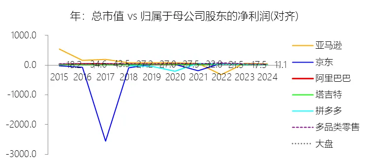 市盈率:2026财年Q2 TTM,阿里巴巴的归属于母公司股东的净利润(对齐)为170.40亿美元,对比年初减少5.99%,总市值与归属于母公司股东的净利润(对齐)的比例为15.9倍(市盈率),对比年初上升4.74个倍数;2016-2025财年(十年),此项合计为1344.41亿美元,平均比例为25.0倍,比多品类零售行业的均值低16.55个倍数,长期呈下降趋势。**比例短期上升主要由于**在2026财年中期,阿里巴巴总市值由于“AI驱动”战略带来的科技溢价及大规模注销式回购的提振,实现了33.99%的显著增长,而同期归属于母公司股东的净利润因公司持续加大对人工智能、用户体验及即时零售等战略领域的投入而减少了5.99%,分子端的快速扩张与分母端的结构性收缩共同驱动了市盈率倍数的回升。**比例长期下降主要由于**随着公司业务规模达到极高基数,在大数定律作用下,营收与利润的增长动能由早期的爆发式扩张转向高质量稳健增长,市场由此对公司进行了从“高成长科技股”向“成熟价值股”的估值逻辑重塑;同时,过去十年间持续的监管环境变化(如反垄断治理)、电商行业竞争格局的剧烈演变,以及公司业务模式由高毛利平台模式向涉及重资产和库存成本的“新零售”模式转型,均导致了长期估值中枢的下移。**比例低于多品类零售行业的均值主要由于**阿里巴巴作为数字平台经济的领军者,其估值表现深受平台经济专项整治、巨额行政处罚以及地缘政治紧张带来的ADS退市风险等非经营性因素的压制,在资本市场产生了显著的“平台折价”效应;此外,公司生态体系内包含大量如本地生活、数字媒体及海外扩张等处于长期投入亏损期的业务板块,这种复杂的业务结构相比于业务模式单一、盈利相对稳健的传统多品类零售商,面临更高的盈利不确定性风险溢价,从而导致其整体市盈率水平长期低于行业均值。