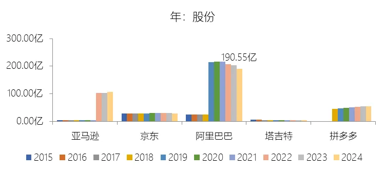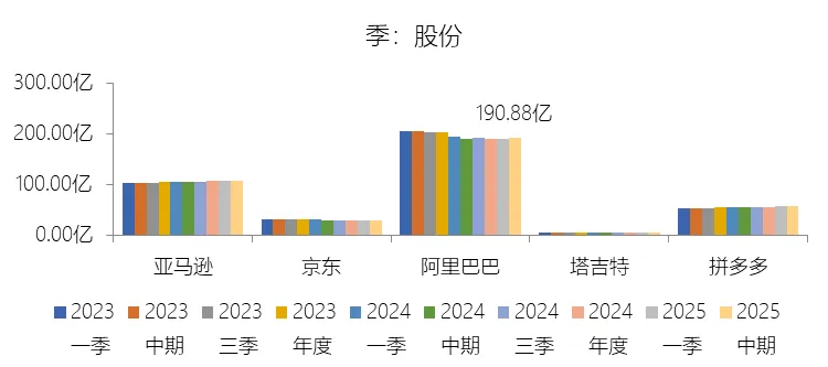 股份增长率:2026财年中期末,阿里巴巴的股份为190.88亿股,对比年初增长0.18%,增速同比(去年同期)上升6.68个百分点;2016-2025财年(九年)增长669.06%,年复合增长25.44%,比多品类零售行业的复合增速高4.79个百分点,长期呈下降趋势。