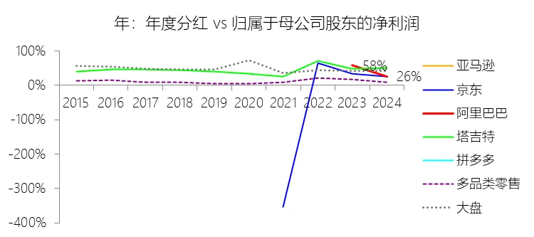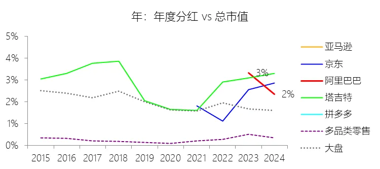 年度分红:2025财年,阿里巴巴的年度分红为47.70亿美元,同比减少27.27%,与归属于母公司股东的净利润的比例为26.31%(分红率),同比下降31.84个百分点;2016-2025财年(十年),此项合计为113.27亿美元,平均比例为8.43%,比多品类零售行业的均值低2.51个百分点,长期呈下降趋势。