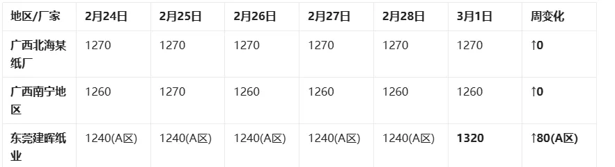 事件:东莞建晖纸业发布3月2日新价格,桉木片统一上调至1320元(较2月4日上涨40-80元),杂木片统一上调至830元(上涨30元)。
