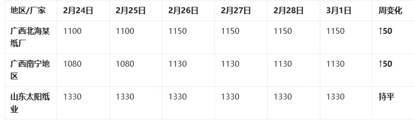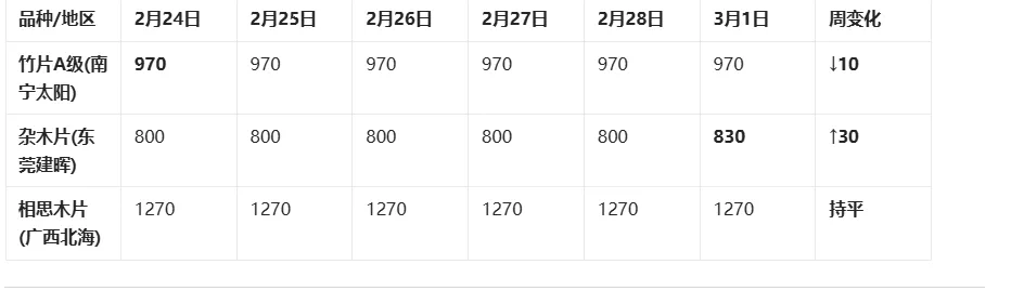 上涨阶段(2月24-26日):节后复工初期,广西桉木片、松木片出现明显上涨,幅度10-50元/吨。