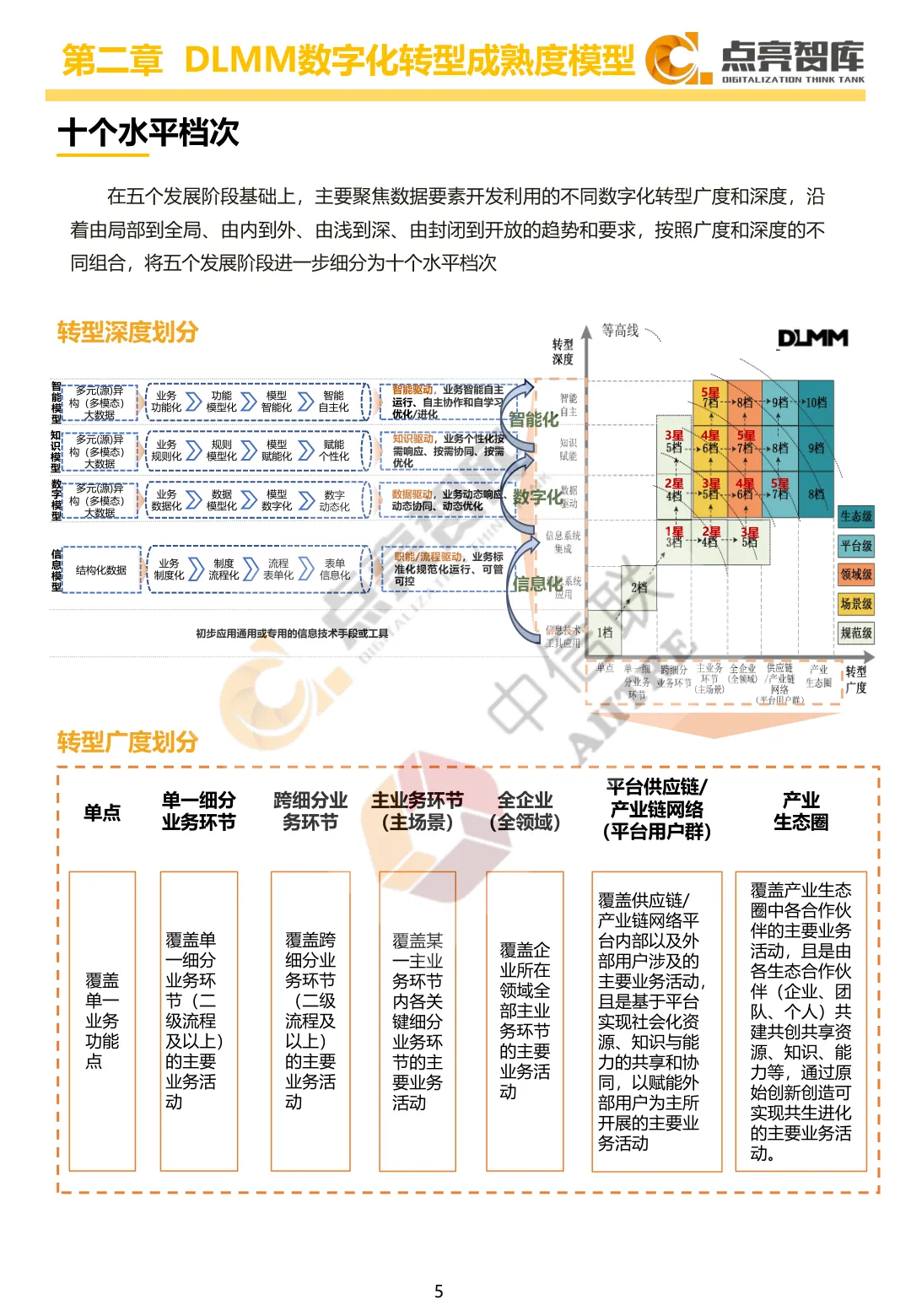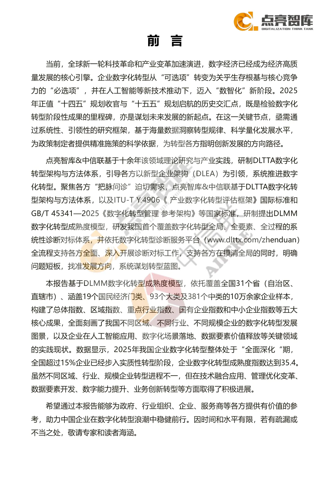 评估体系:DLMM数字化转型成熟度模型,以“转战略、转业务、转能力、转管理、转技术”五位一体为核心,划分规范级、场景级、领域级、平台级、生态级五个发展阶段,细分为十个水平档次,覆盖转型全要素、全过程。 总体进展:2025年全国企业数字化转型成熟度指数达35.4,较2024年增长6.1,增幅达20.8%;15.08%的企业迈入实质性转型阶段(场景级及以上),3档及以上企业占比大幅增长,转型从“局部试点”向“系统协同”加速突破。 关键指标:38.5%的企业实现数据自动采集,48.8%的数据资源实现统一汇聚,25.3%的企业完成智能设备设施互联;但核心业务AI深度应用普及率仅5.6%,企业级数据治理体系建设普及率8.0%,深度转型仍有较大提升空间。