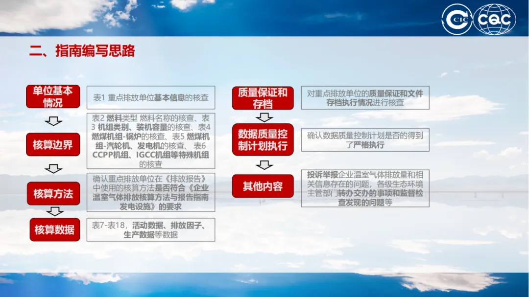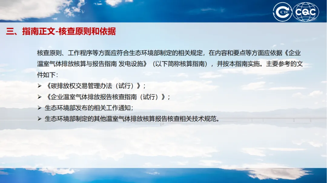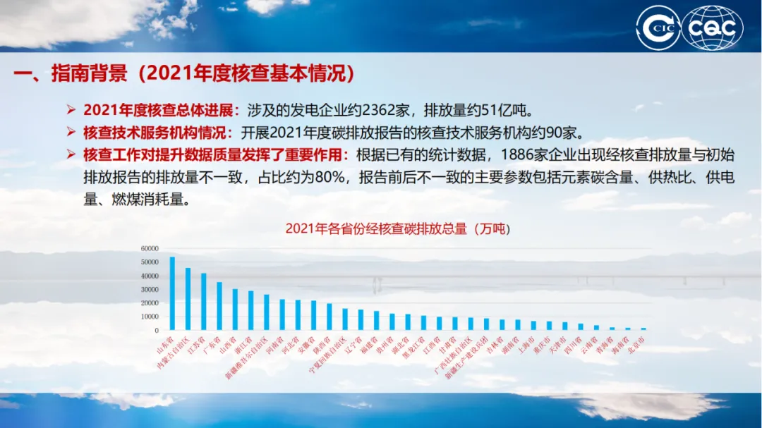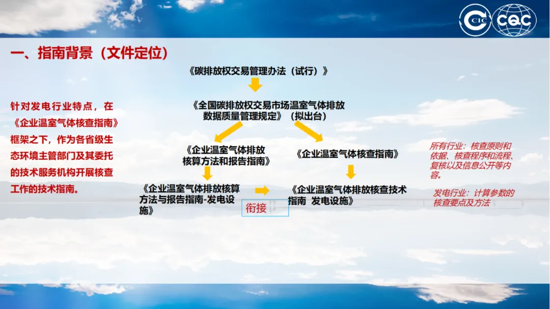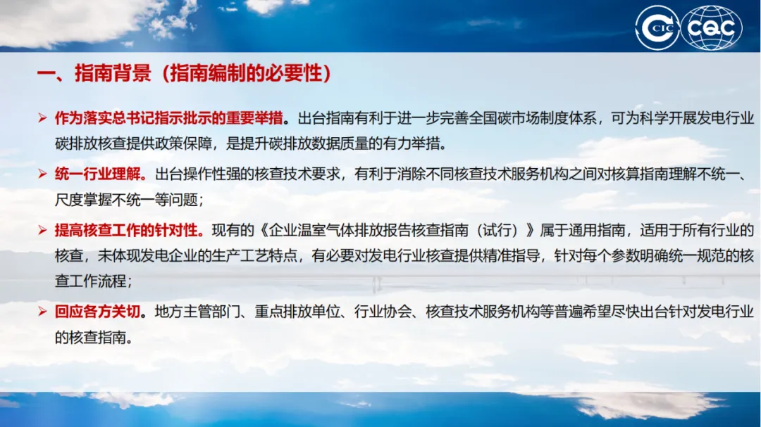 2、第二份 PPT来自中国质量认证中心,全面解读 《企业温室气体排放核查技术指南 发电设施》:从背景入手,分析了发电行业碳排放核查的进展,与核查中存在的企业排放量报告不一致、数据不真实、机构行业理解不统一等问题,阐述了指南编制对落实政策要求、完善碳市场制度体系、统一核查尺度的必要性;