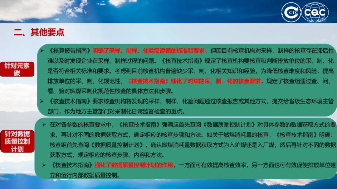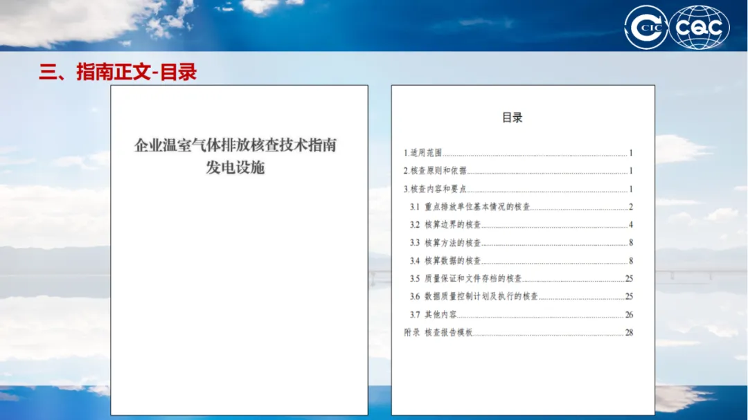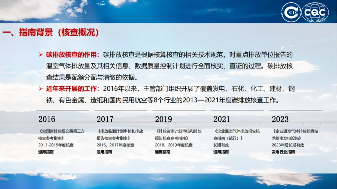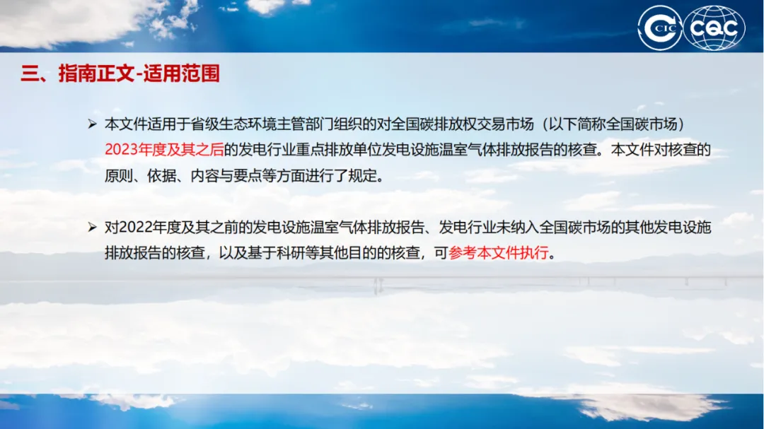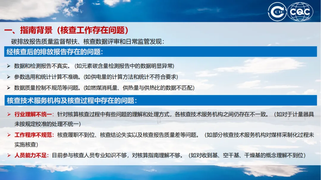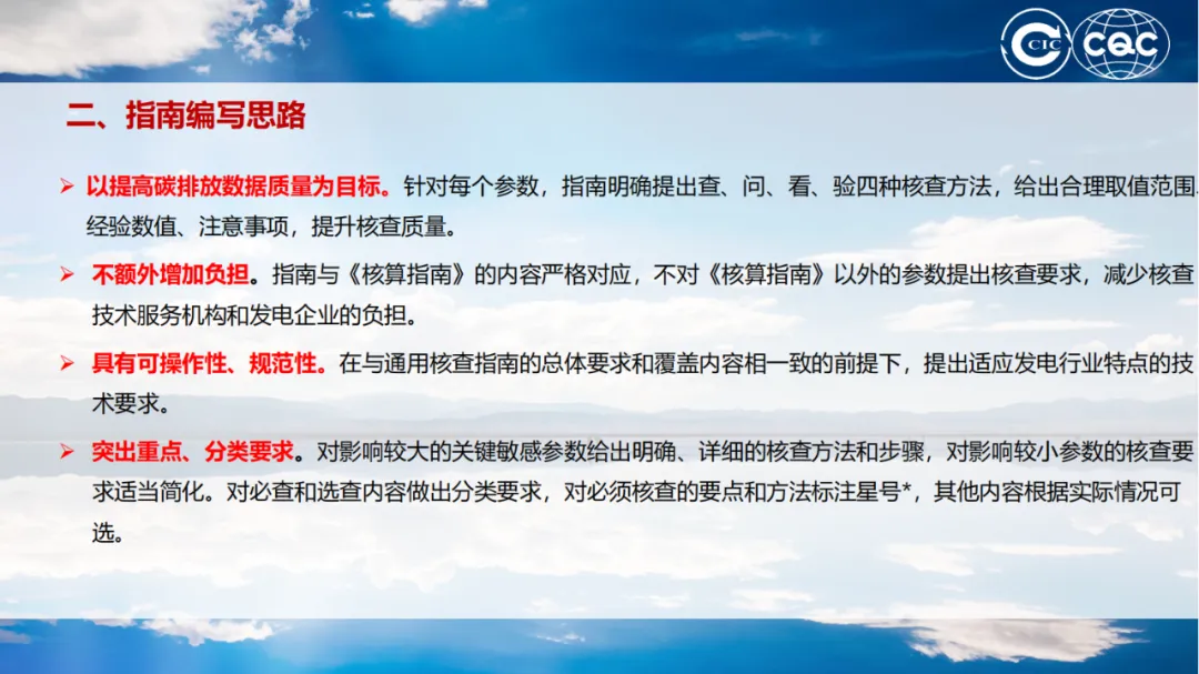 2、第二份 PPT来自中国质量认证中心,全面解读 《企业温室气体排放核查技术指南 发电设施》:从背景入手,分析了发电行业碳排放核查的进展,与核查中存在的企业排放量报告不一致、数据不真实、机构行业理解不统一等问题,阐述了指南编制对落实政策要求、完善碳市场制度体系、统一核查尺度的必要性;