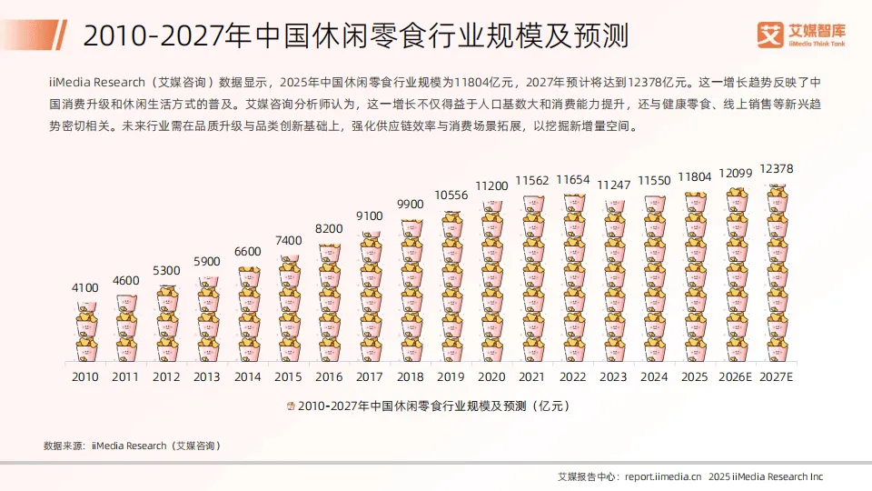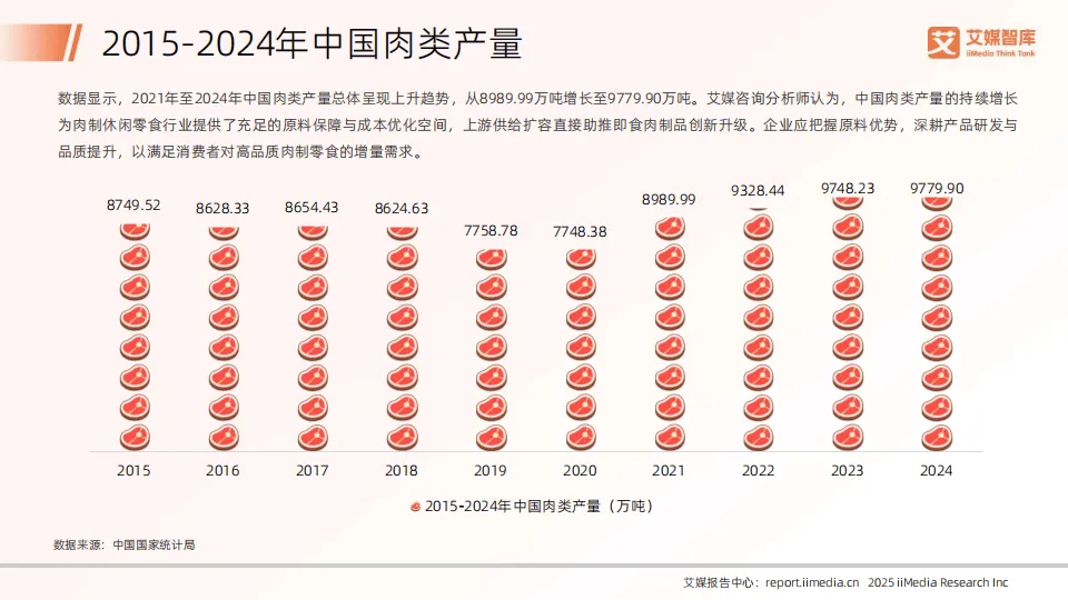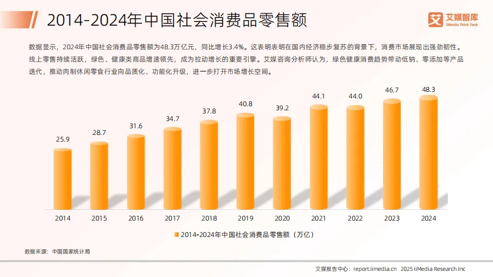 2025年中国肉制休闲零食行业依托消费市场复苏、上游原料供给充足迎来发展机遇,同时在消费升级驱动下呈现品质化、功能化升级趋势。2024年社会消费品零售额达48.3万亿元,肉类产量增至9779.90万吨,为行业发展奠定基础;2025年休闲零食行业规模达11804亿元,零食集合店规模1239亿元,后者成为肉制休闲零食重要增量渠道,推动行业渠道与产品创新。