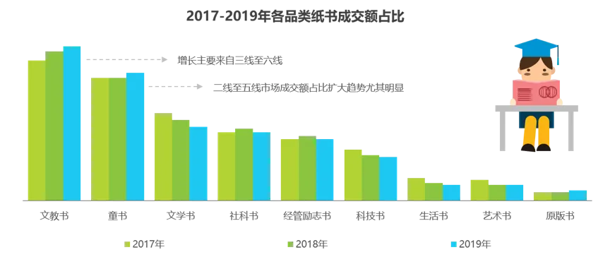 报告显示,一二线市场仍是主力地区,低线市场是增长引擎。文教书和童书两大品类在2019年持续扩大市场份额。受中小学语文教育改革、科技热浪持续升温等社会热点影响,中小学课外读物、科普百科类童书以及科幻文学等品类快速增长。在新书品种数量较去年大幅下降的同时,成交额不降反升;每个新品成交额同比去年增长超过30%。
