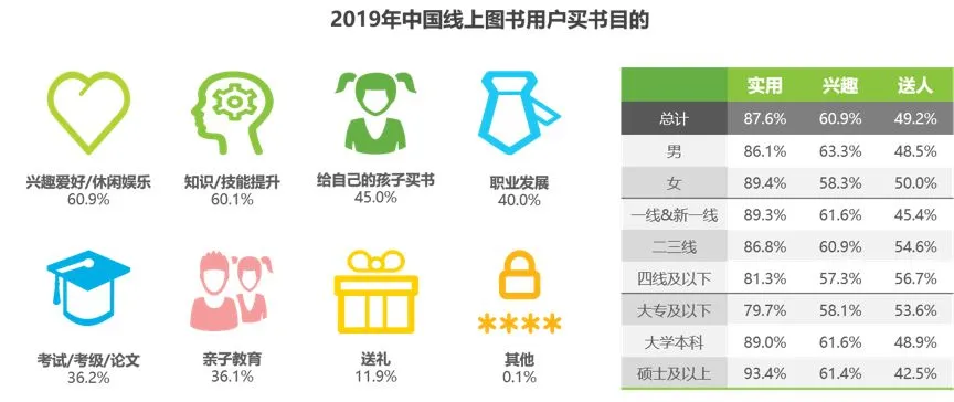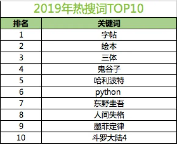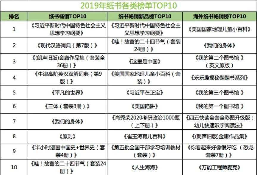 从品类来看,近三年文教书、童书和文学书三种图书类型稳居成交额前三。其中,文教书、童书的市场规模持续扩大。这主要是因为近年来教育教学改革不断深化,以及家长注重对孩子阅读习惯的培养。预计在2020年,这两类图书的市场占比还将继续扩大。通过报告内容可以看出,中小学课外读物作为文教书第一大品类,2019年成交额同比增速将近50%,预计在2020年,其成交额还将走高。这与国家近年来提倡大语文、中小学语文教育改革有很大关系。童书中的儿童文学、绘本、科普百科三大细分品类的成交额同比增速超过童书整体增速,导致这三个细分品类在童书成交额中的占比逐年提升,从2017年的65.6%,到2018年的66.4%,再到2019年的69% 。三大细分品类中,成交额同比增速最高的是科普百科类童书,将近40%。AI、5G、区块链、机器人、VR、智能家居、AR这些热点词,不断点燃科技热潮,科技在改变大众生活的同时,也吸引了越来越多家长的关注,从小培养孩子对科技的兴趣和热爱。爆款影视剧带动原著销量增长已成常态,如2019年大热电视剧《亲爱的,热爱的》《小欢喜》,前者播出后原著小说日销是播出前日销的20多倍,后者播出后原著小说销量是去年同期39倍。报告显示,2017年中国图书出版种数(包括新版图书和当年重印图书)突破50万种,2018年达51.9万种,同比增长1.3%。2017年至2018年图书出版种数保持增长,但其中重印图书品种在上升,新版图书品种在下降。而在2019年,新书出版品种数量持续下降,只有2018年的80%。在新书品种数量较去年大幅下降的同时,成交额不降反升;每个新品成交额同比去年增长超过30%。其中,文教书、社科书、科技书类新书成交额占比及增幅位列前三。通过2019年新书表现可以看出,图书市场发展结构逐渐优化。对出版行业来说,更加注重精品的挖掘以及重点书的营销推广,不断提高新书市场规模,是必由之路。根据报告的调研内容,2019年中国线上图书用户不同阅读形式中,电子书占94.1%,纸书占77.0%,听书占64.1%,55.6%会阅读报纸/杂志。国民阅读习惯的改变,推动了整个图书市场向线上化、数字化、智能化转变,数字阅读已成为主流阅读方式。调研结果显示,从不同阅读形式的时间比重来看,用户看电子书的时间占比已达到47.9%,纸质阅读为24.1%,听书时间占17.5%,阅读报纸杂志时间占10.4%。从阅读频次来看,纸书相对于更加便捷的电子书和听书阅读来说,频次更低,月均阅读35.8次,而电子书高达50.2次,听书也有40.9次。并且,电子书和听书由于更加方便,用户的单次阅读时长也更长;单次阅读纸质书在一小时以上的用户占比22.4%,但电子书高达35.4%,听书也有32.2%。由于读者阅读习惯的改变,现在“纸电同步”销售越来越受到出版行业的关注和重视。报告显示,一本书同时有纸书和电子书两个出版形式变得越来越普遍,“纸电同步”销售的品种占比越来越高:从2017年的14.3%,到2018年的23.7%,到2019年已经超过35%。同时,有近20%的用户,在购买电子书后又买了纸质书。许多电子书用户还习惯于购买会员服务以获得更广泛的电子书资源——2019年购买京东电子书的用户中,有超过30%的用户购买了VIP服务。报告显示,2019年成交额前十均为经济较发达的省份,其中北京人花了最多钱买书,成交额最高;湖北省图书成交额增速最大。根据报告数据,在2019年无论是用户数量,还是成交数量和成交额,北京、上海、广州、深圳、成都五座城市都排在前列。2019年纸书榜中,《习近平新时代中国特色社会主义思想学习纲要》名列第一。每年党政纲要新书上市都会一定程度带动图书市场销量增长; 《哇!故宫的二十四节气》作为新书也有上好表现。多数上榜书都是经典长销书,如《现代汉语词典》《平凡的世界》《三体》和《原则》连续两年上榜。TOP10中新书只占两席,TOP100中新书占比不到两成。一方面经典之作常读常新,有无穷生命力;另一方面新书还需继续发力。根据京东大数据,2019年纸书畅销新品榜TOP10中,有3种是社科新书,文学和童书各占两席。2019年9月才出版的《这里是中国》借助京东图书平台销售优势,不仅名列新书榜第三,而且进入总榜前十五,成为年度黑马。《哇!故宫的二十四节气(套装24 册)》《这里是中国》《美国陷阱》《崔玉涛育儿百科》和《人生海海》的作者全部凭借2019年新书入围作者榜TOP10。2019年电子书畅销榜TOP10中,以经典金融理财类书籍、管理类以及计算机类工具书籍为主。其中经典金融理财类书籍占四席,《富爸爸穷爸爸》《穷查理宝典》《财务自由之路》和《证券分析》纷纷上榜。《原则》连续两年蝉联榜首,也是唯一一种同入2019年纸书、电子书双榜前十的图书。在京东图书2019年最受欢迎作者TOP10中,排名第一的是肖秀荣,每年数以百万考研大军撑起了其在图书界的霸主地位。此外,随着故宫博物院爆红,以《故宫日历》、《哇!故宫的二十四节气》为代表的故宫文创产品也越发受到喜爱而登上榜单。星球研究所也凭借着2019年爆款书《这里是中国》成为书界网红。从京东图书2019年搜索热词来看,用户更加偏好精准搜索。热搜词TOP10中,6个是具体书名,python是具体名词,东野圭吾是具体作者,只有字帖和绘本是图书类目。热搜词TOP10中,消费者搜索最多的是“字帖”。读书和习字一直是学习的重要组成部分,目前的中国应试大环境是——考试不仅有答题得分,还有卷面分;尤其