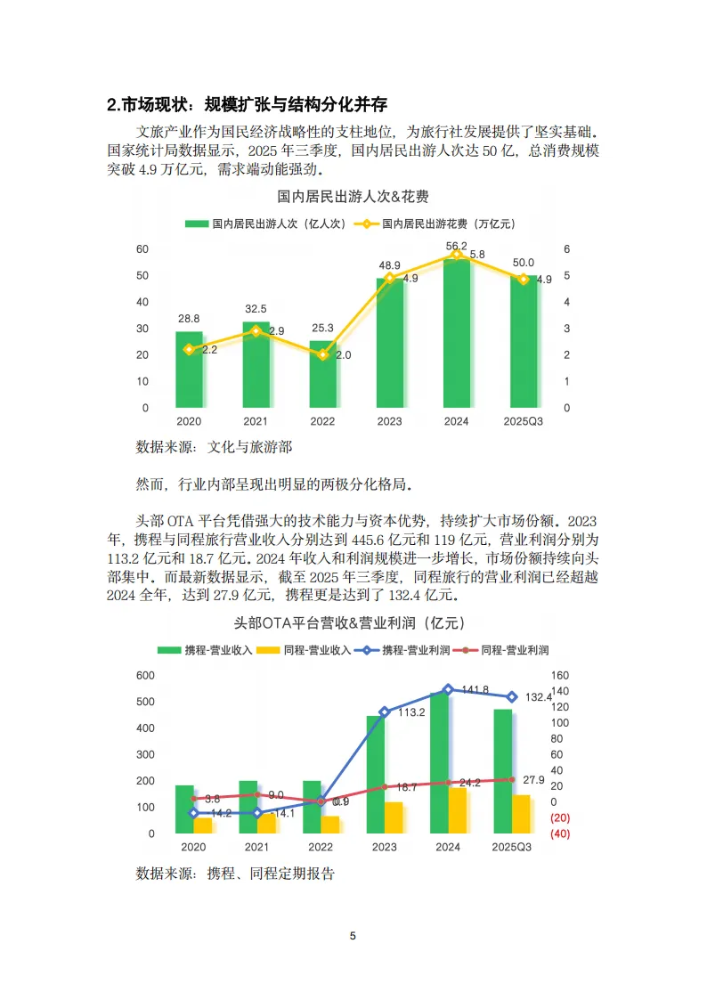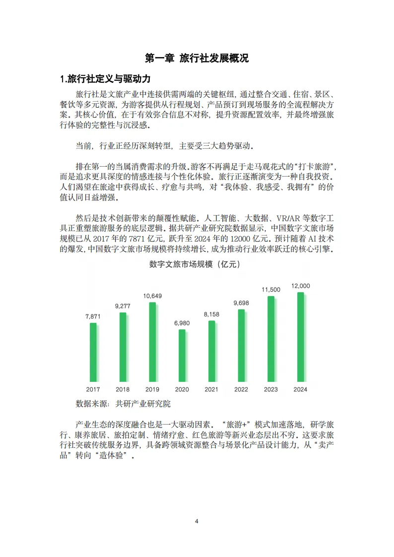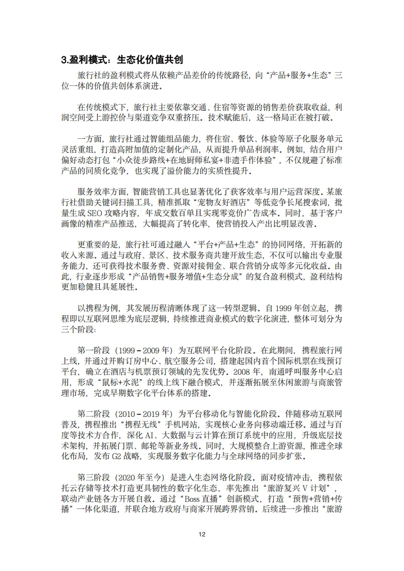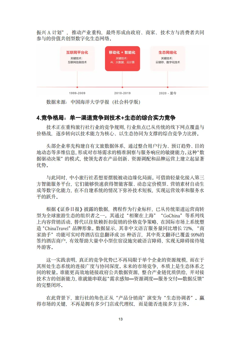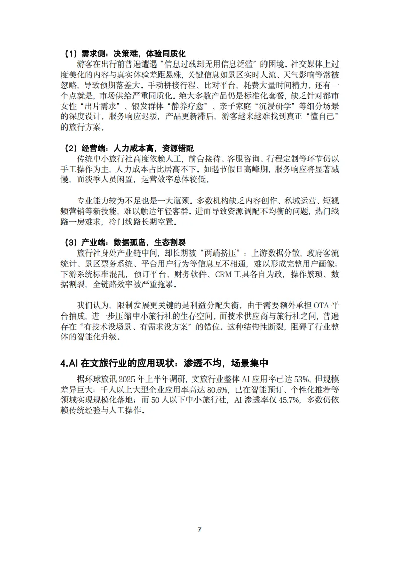 2025年中国旅行社行业正处于深度转型阶段,消费升级、技术迭代与产业生态融合三大因素驱动行业重塑,人工智能成为破解行业长期痛点、推动创新发展的核心力量,其应用也从效率提升工具转变为渗透产品设计、服务体验、生态合作的核心要素,行业竞争逻辑与发展模式随之发生根本性变化。