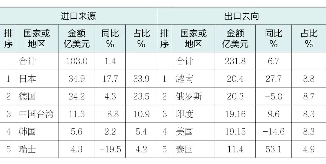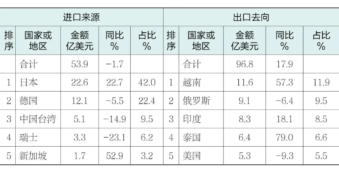 机床工具产品进口来源和出口去向排名前五的情况,详见表4。