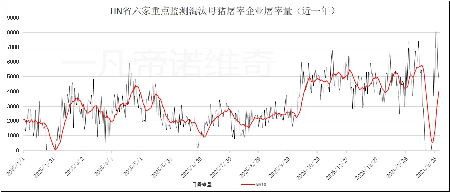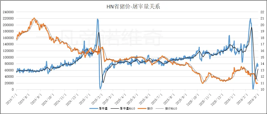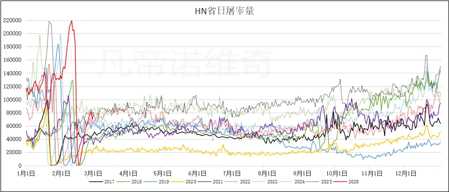 2026年2月HN省共屠宰生猪304.93万头,同比增长74.11%,环比下降18.4%。