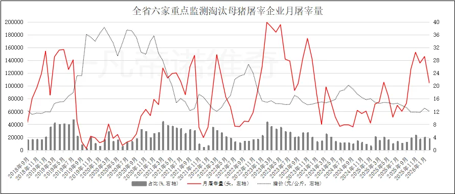 HN省六家重点监测淘汰母猪屠宰企业2月总屠宰量为10.48万头,环比下降28.2%,同比增加45.91%,占全省总屠宰量的比例为3.44%,占比较上月下降0.46个百分点。