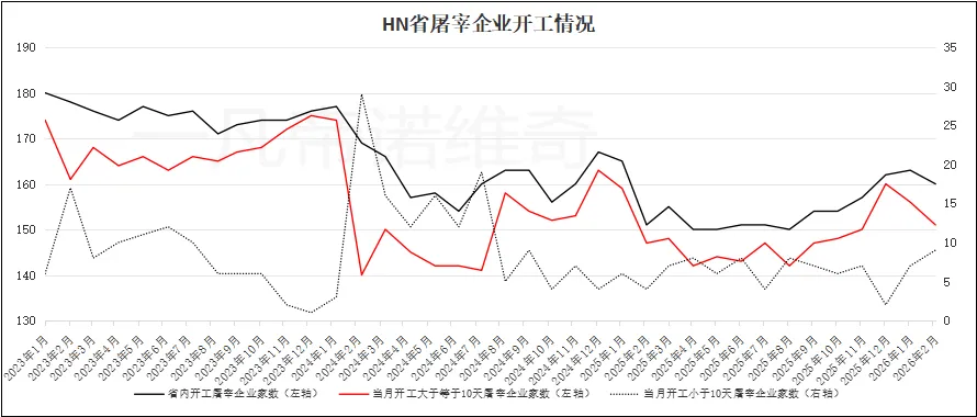 HN省2026年2月有开工记录的屠宰场共160家,环比2026年1月减少3家,比去年同期增加9家,其中屠宰天数小于10天的屠宰企业由上月的7家增长为9家,开工数大于10天的屠宰企业151家,比上个月减少5家。