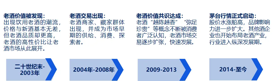 根据不同时期的历史特征,老酒市场发展大致经历四个阶段: