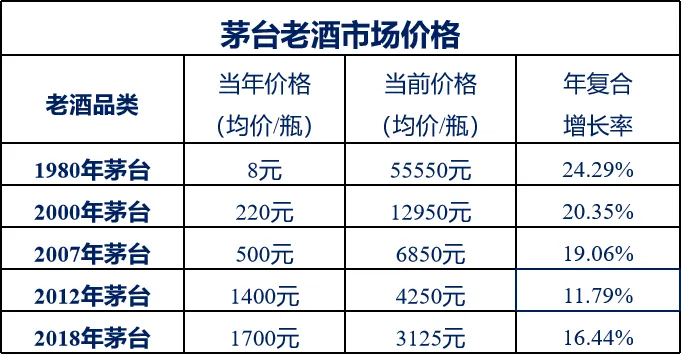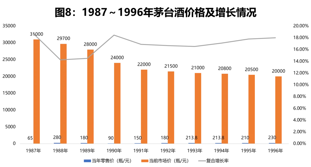 贵州茅台酒(1985-1996)出厂以来至今,各年份产品的价格均实现了数百倍的增长。其中,1987年份的茅台酒当前市场价格较出厂时零售价增长了30935元,翻了477倍。