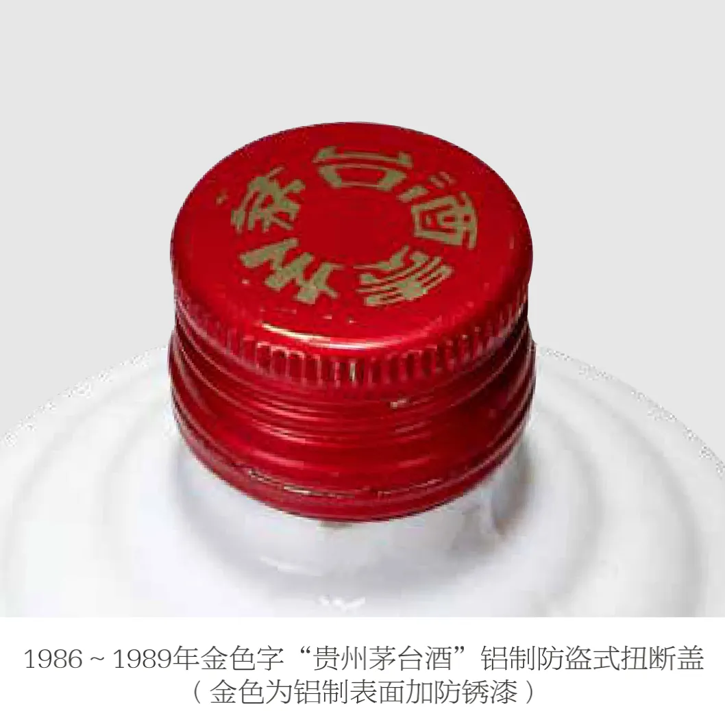 1986年至1987年2月年生产的扭断式防盗金属铝盖茅台酒彩盒上印有“地方国营茅台酒厂出品”字样,1986~1989年五星标识扭断式防盗金属铝盖茅台盖顶的“贵州茅台酒”有金色和银色两种,金色是一层防锈漆,银色是铝的本色;1986~1990年的度数和容量标注在包装盒上;1986~1988年内销的五星标识茅台酒精度数为54%vol。