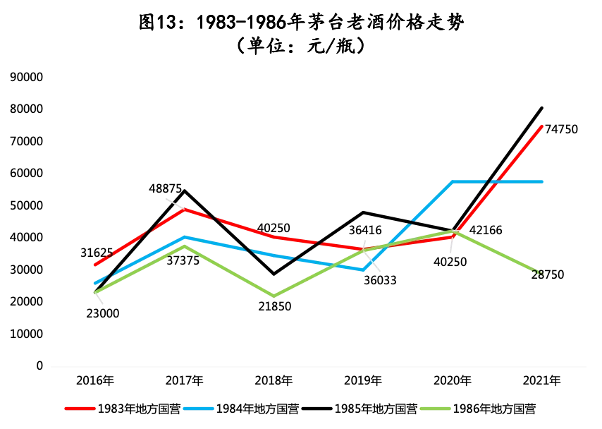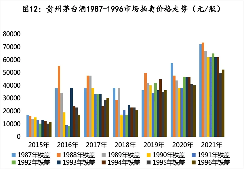 2010年以歌德盈香开办首场老酒拍卖为标志,白酒开始进入拍卖市场。自此,整个老酒拍卖市场始终是茅台一枝独秀。数据显示,2021年,1983-1986年产地方国营茅台老酒拍卖成交价格达到单瓶约75000元,而1987年产茅台老酒拍卖成交价格达到单瓶72500元,5年内平均拍卖价格达到42600元/瓶。