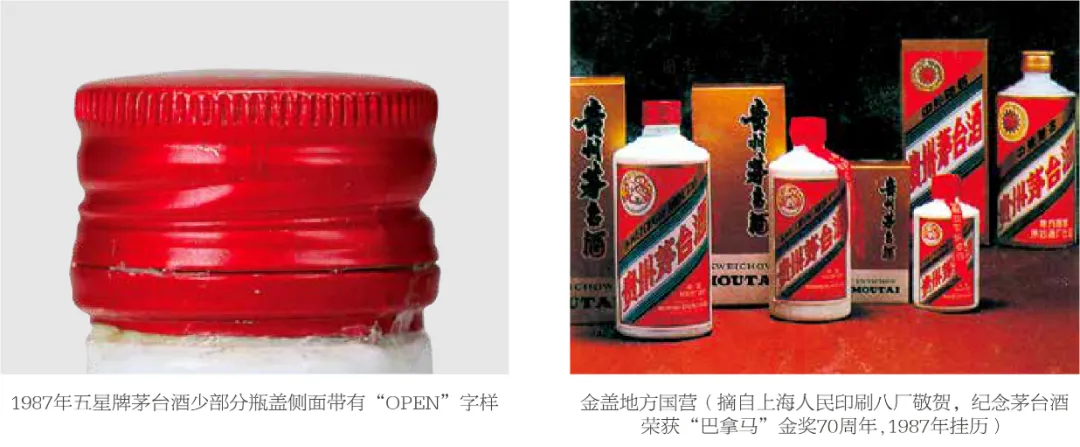 特征:1987年1月,五星标识茅台酒全部用扭断式防盗金属铝盖。1987年五星标识茅台酒的特征与1986年茅台酒基本相同,其包装盒上“地方国营茅台酒厂出品”更改为与商标一致的“中国贵州茅台酒厂”。此年份的茅台酒有一种特殊背标,红色边框较大、字体间距较大,俗称“大背标”。其中少部分瓶盖侧面印有“OPEN”标识。