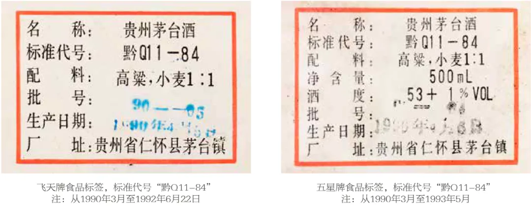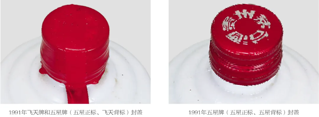 1990~1991年底,五星标识贵州茅台酒(五星正标、飞天背标)两条红丝带都书“中国贵州茅台酒”。