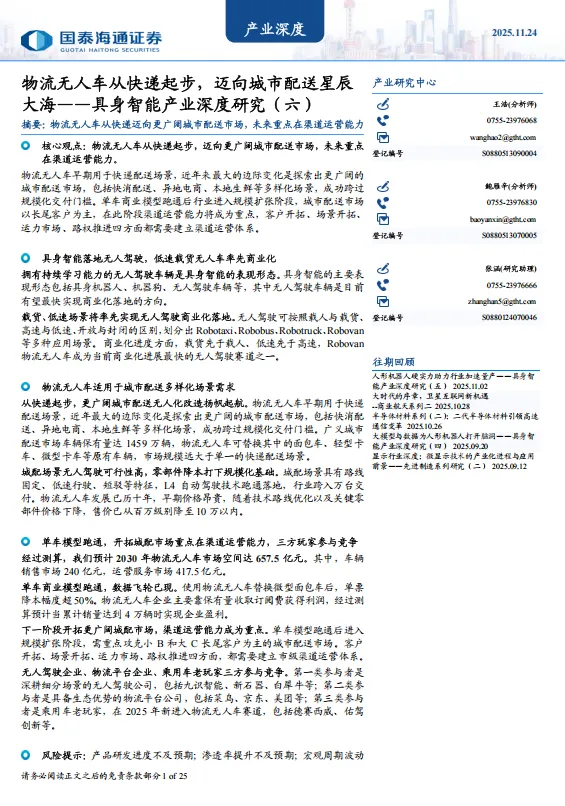 国泰海通证券-产业深度:物流无人车从快递起步,迈向城市配送星辰大海——具身智能产业深度研究(六).pdf