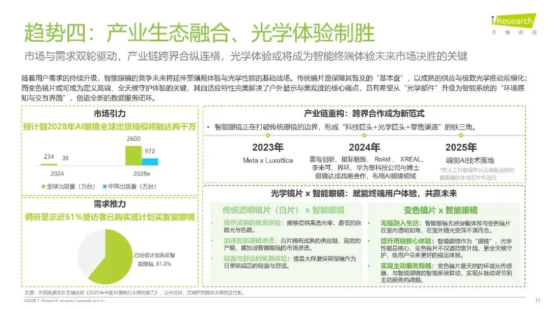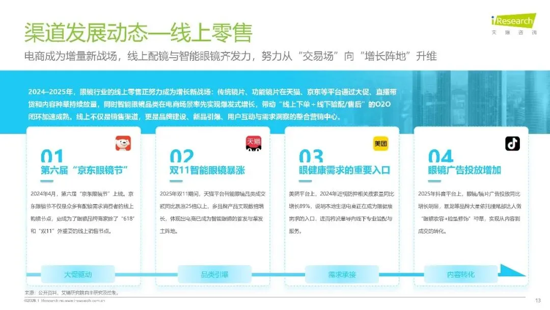 产业格局方面,“国际龙头 + 国产崛起” 的竞争态势愈发清晰。渠道方面,线上线下加速融合,2025 年双 11 智能眼镜成交额同比暴涨 25 倍,而线下门店则向 “专业体验中心” 转型。