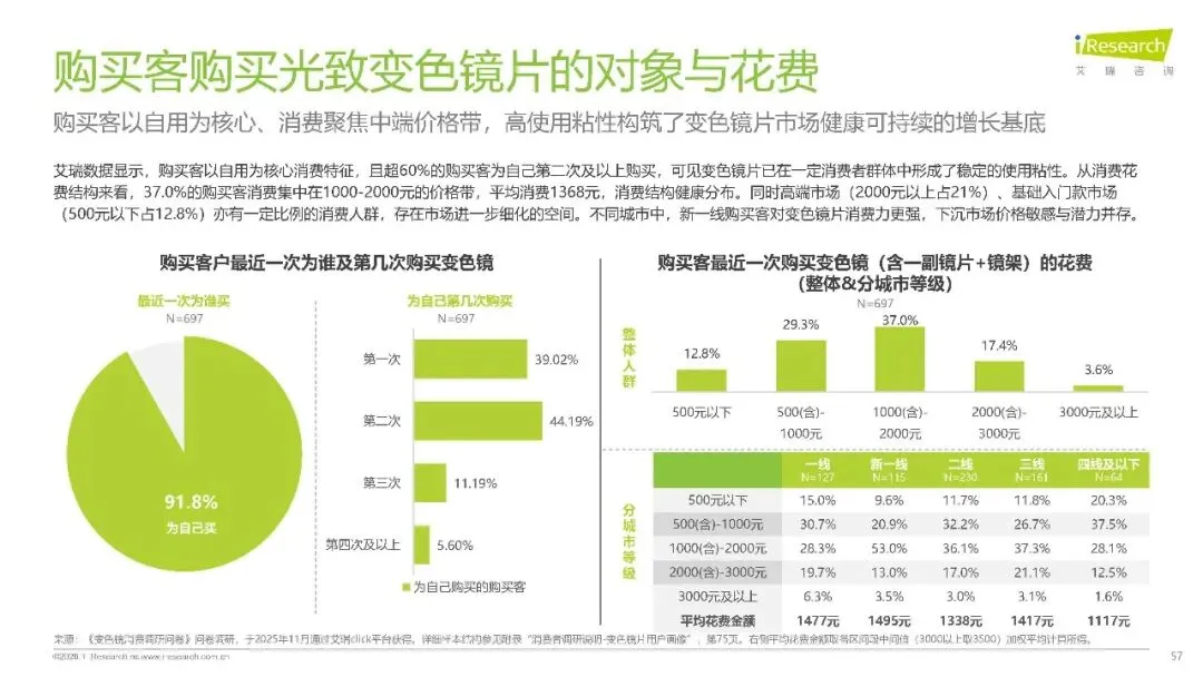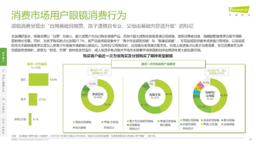 从消费行为来看,眼镜消费呈现鲜明的人群特征:自用需求占比 63.8%,超七成购买普通近视眼镜;为孩子购买占 27.1%,聚焦近视防控;为伴侣,父母购买时,成人渐进镜占比更高,消费者愿意为舒适体验支付溢价。这种需求分化推动产品持续创新,离焦镜的精准控轴技术、自由环曲面的高精度成像、渐进镜的智能化设计,共同构成了行业升级的技术内核。