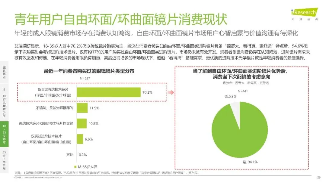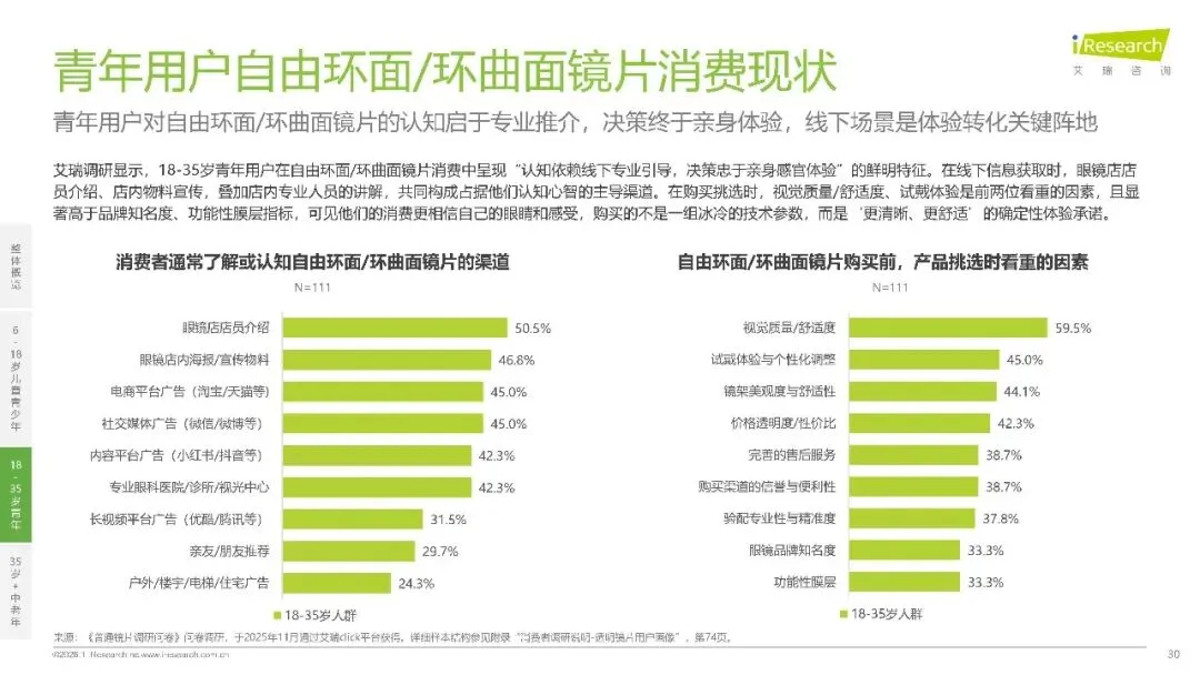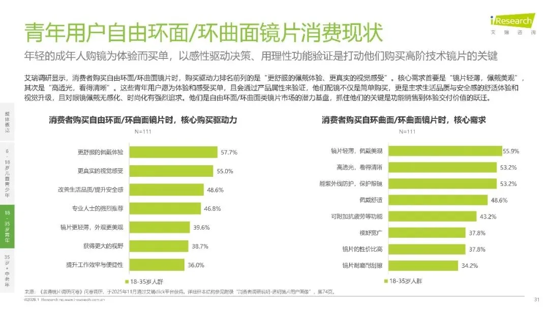 18至35 岁青年群体的用眼场景高度数字化,69% 的人遭受数字眼疲劳困扰,日均屏幕使用时长超 6 小时。传统球面镜片已难以满足多屏切换需求,自由环面,环曲面镜片凭借全域清晰优势快速崛起。尽管 70.2% 的青年仍选择传统镜片,但 94.1% 的人了解到进阶镜片 “视野大、看得真、更舒适” 的优势后表示愿意尝试,市场认知鸿沟背后是巨大的升级潜力。这一群体的消费逻辑更偏向感性体验,59.5% 看重视觉质量与舒适度,45.0% 重视试戴体验,“更舒服的佩戴体验” 和 “更真实的视觉感受” 成为核心购买驱动力。