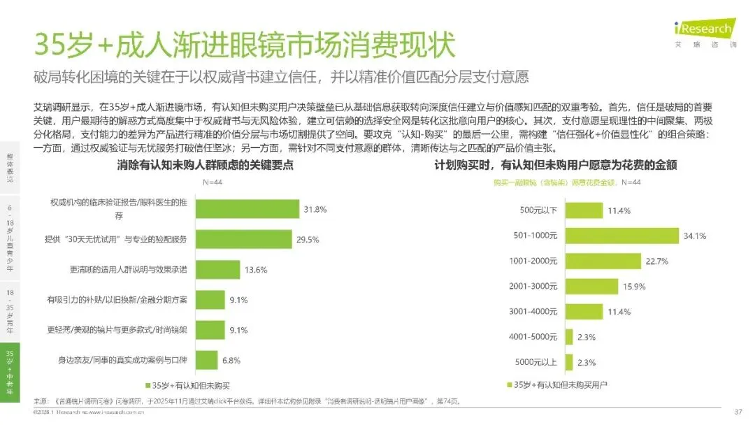 35 岁以上人群的老视需求正从 “能看清” 向 “看得好且舒适” 升级,渐进镜成为主流解决方案,2024 年市场规模已达 26.2 亿元。但认知转化仍存阻碍,82.9% 的调研用户未购买渐进镜,27.3% 的人担心适应困难,25.0% 不确定效果是否优于普通镜片。消费者期待权威机构验证和 30 天无忧试用等服务来建立信任,支付意愿呈现中间聚集特征,34.1% 的人愿意花费 501至1000 元,22.7% 选择 1001至2000 元价格带,形成了清晰的分层需求。
