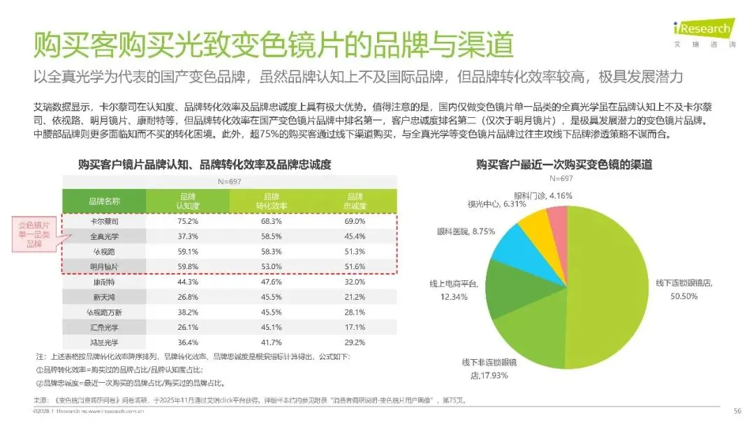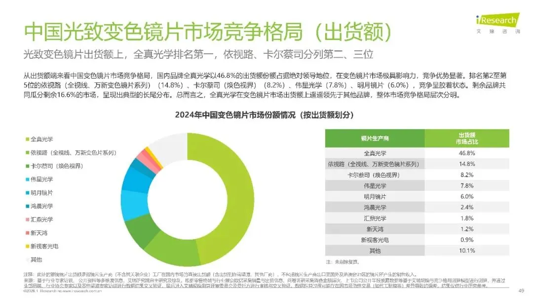 光致变色镜片作为增量赛道表现亮眼,超八成消费者听说过该产品,2024 年零售市场规模达 14.7 亿元,预计 2029 年将增至 23.7 亿元。这类镜片实现了 “一镜两用”,覆盖近视、散光、老视等多种屈光需求,适配通勤、驾驶、户外运动等全场景,44.4% 的购买客几乎长期佩戴,57.8% 用于日常通勤,57.0% 适配夏季强光场景。市场竞争呈现 “二元格局”,全真光学以 46.8% 的出货额占比和 42.8% 的出货量占比稳居首位,凭借膜变工艺和全折射率覆盖构建起性价比优势。
