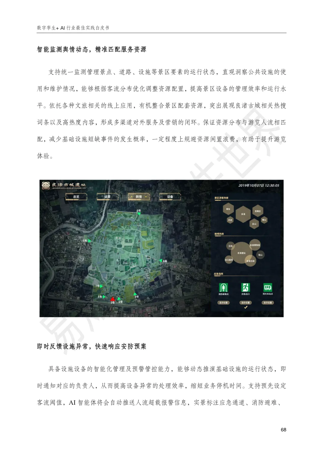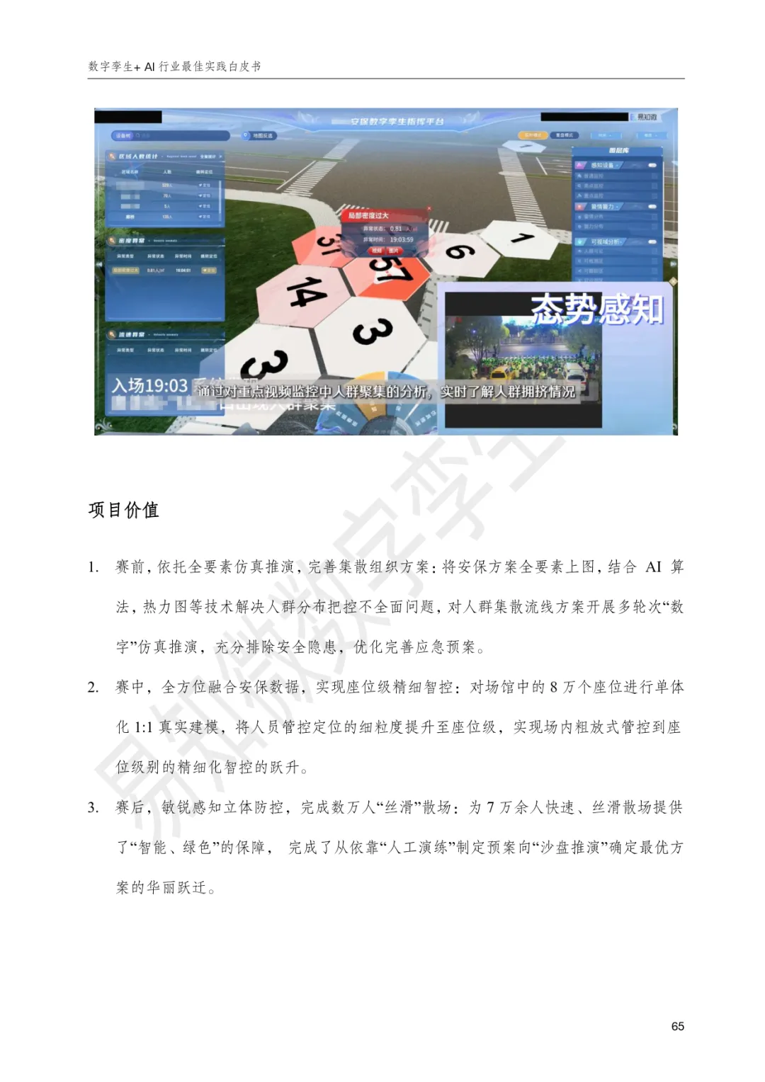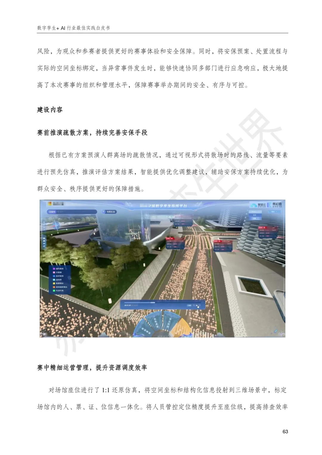 白皮书系统梳理了各行业在数字化转型中的核心痛点与应对方案:能源矿产领域,通过数字孪生实现光伏产品全生命周期监测与集团级数智驾驶舱建设,提升绿色智造与安全管理水平;工业制造领域,聚焦产线全要素映射与柔性生产,实现汽车、物联网等高复杂度制造场景的仿真推演与预测性维护;水利水务领域,构建长江流域防洪调度、西南水电地质灾害防控、浙江水库全域监管、江苏航道船闸精细化运营等体系,推动从被动响应到主动防控的治理模式升级;交通运输领域,以数字孪生赋能高速服务区、杭州东站、铁路物流、智慧港口等场景,实现客流、物流、安全态势的实时感知与跨系统协同;文旅赛事领域,通过孪生仿真优化大型体育赛事安保与疏散方案、良渚古城文化保护与运营、泰山会展中心流程预演与空间管理,兼顾体验提升与风险防控;农牧生产领域,平湖稻米与杭锦后旗牧场案例展示了从种植养殖到加工仓储的全链条数字化监管与资源优化,支撑绿色可持续发展;医药科研领域,以承压部件多物理场耦合仿真与医院立体监管为代表,实现设备安全评估、寿命管理与院区运行风险的精准识别与智能调度。