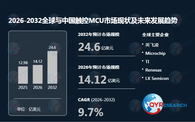 根据QYR(恒州博智)的统计及预测,2025年全球触控MCU市场销售额达到了12.98亿美元,预计2032年将达到24.6亿美元,年复合增长率(CAGR)为9.7%(2026-2032)。