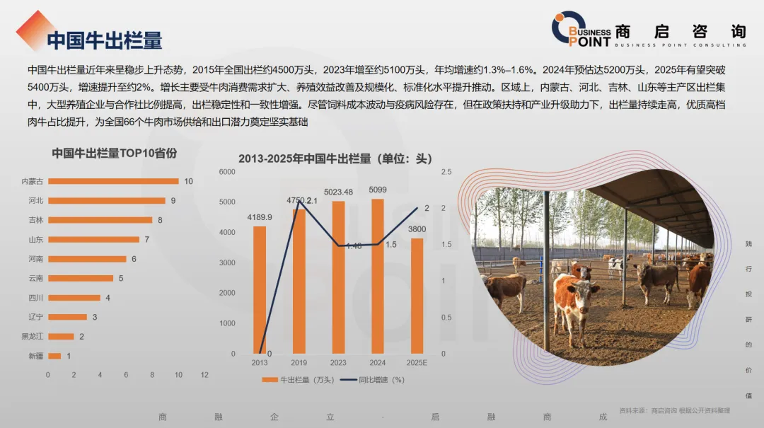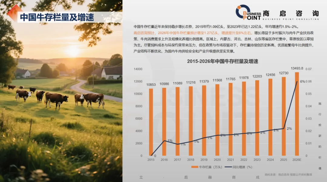 商启咨询预计,2026年中国牛存栏量预计增至1.27亿头,增速提升至6%左右。增长得益于乡村振兴与肉牛产业扶持政策、牛肉消费需求上升及规模化养殖比例提高。区域上,内蒙古、河北、吉林、山东等省区存栏集中,草原牧区以草饲为主。尽管饲料成本与环保约束带来压力,但在政策与市场双驱动下,存栏量持续创历史新高,优质能繁母牛比例提升,产业结构不断优化,为国内牛肉供给安全和产业升级提供坚实支撑。