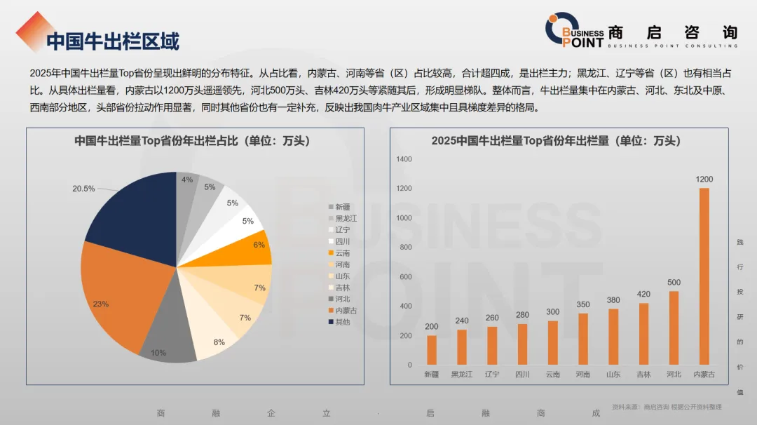 2025年中国牛出栏量Top省份呈现出鲜明的分布特征。从占比看,内蒙古、河南等省(区)占比较高,合计超四成,是出栏主力;黑龙江、辽宁等省(区)也有相当占比。从具体出栏量看,内蒙古以1200万头遥遥领先,河北500万头、吉林420万头等紧随其后,形成明显梯队。整体而言,牛出栏量集中在内蒙古、河北、东北及中原、西南部分地区,头部省份拉动作用显著,同时其他省份也有一定补充,反映出我国肉牛产业区域集中且具梯度差异的格局。