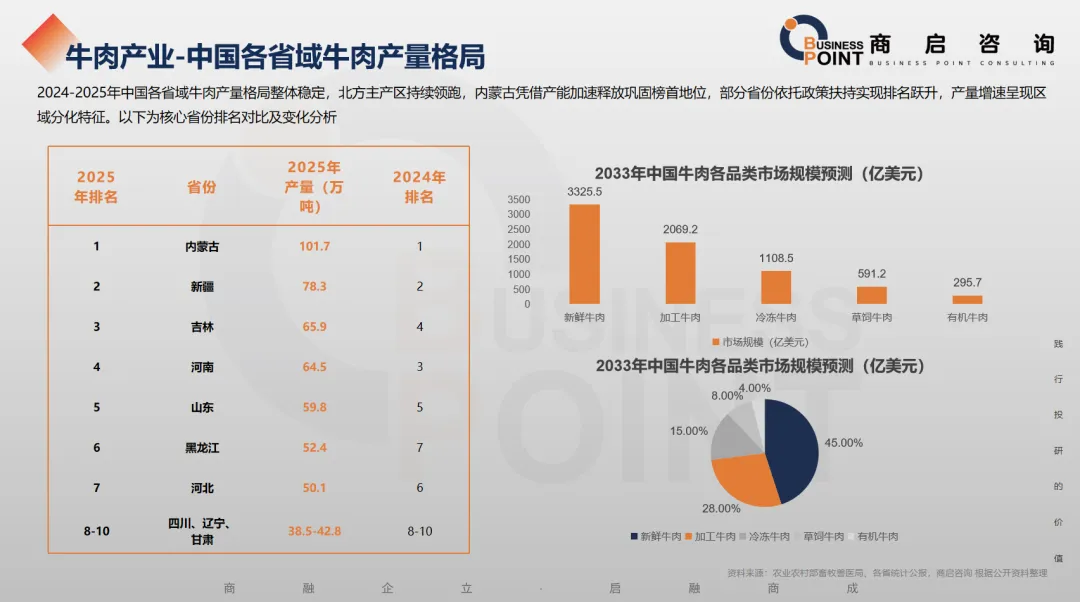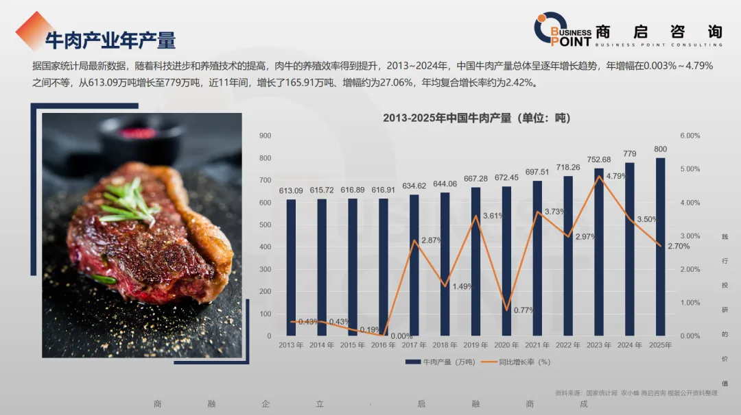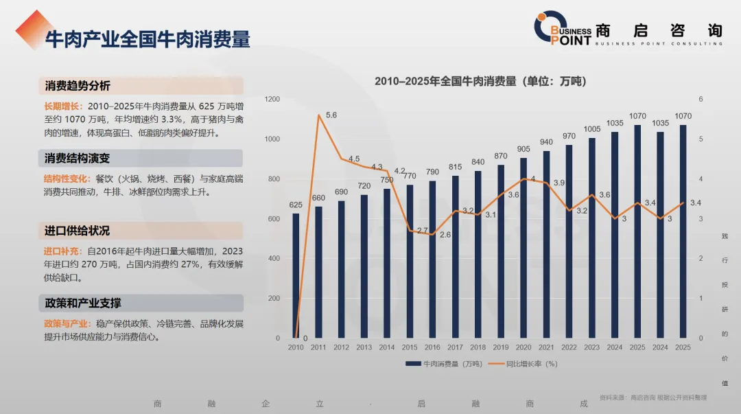 长期增长:2010–2025年牛肉消费量从 625 万吨增至约 1070 万吨,年均增速约 3.3%,高于猪肉与禽肉的增速,体现高蛋白、低脂肪肉类偏好提升。
