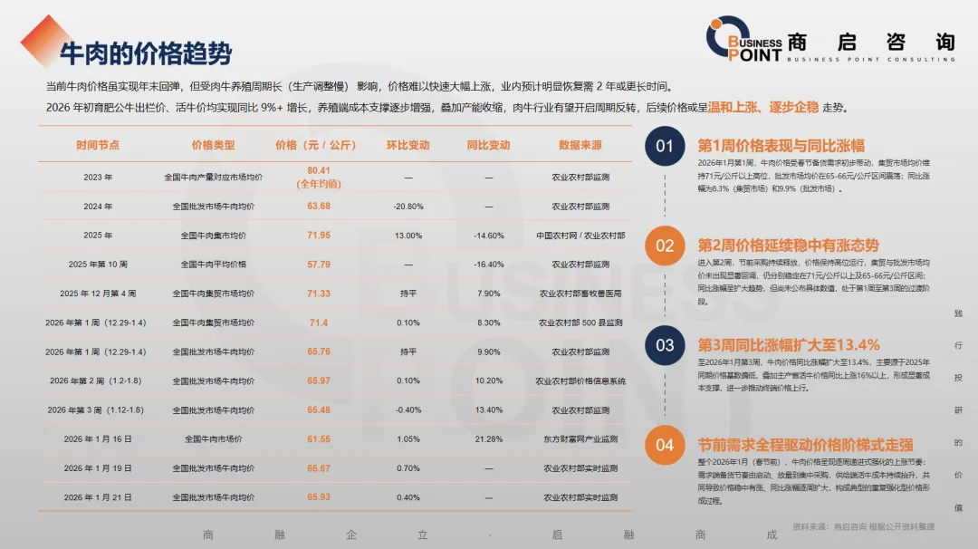 当前牛肉价格虽实现年末回弹,但受肉牛养殖周期长(生产调整慢) 影响,价格难以快速大幅上涨,业内预计明显恢复需 2 年或更长时间。