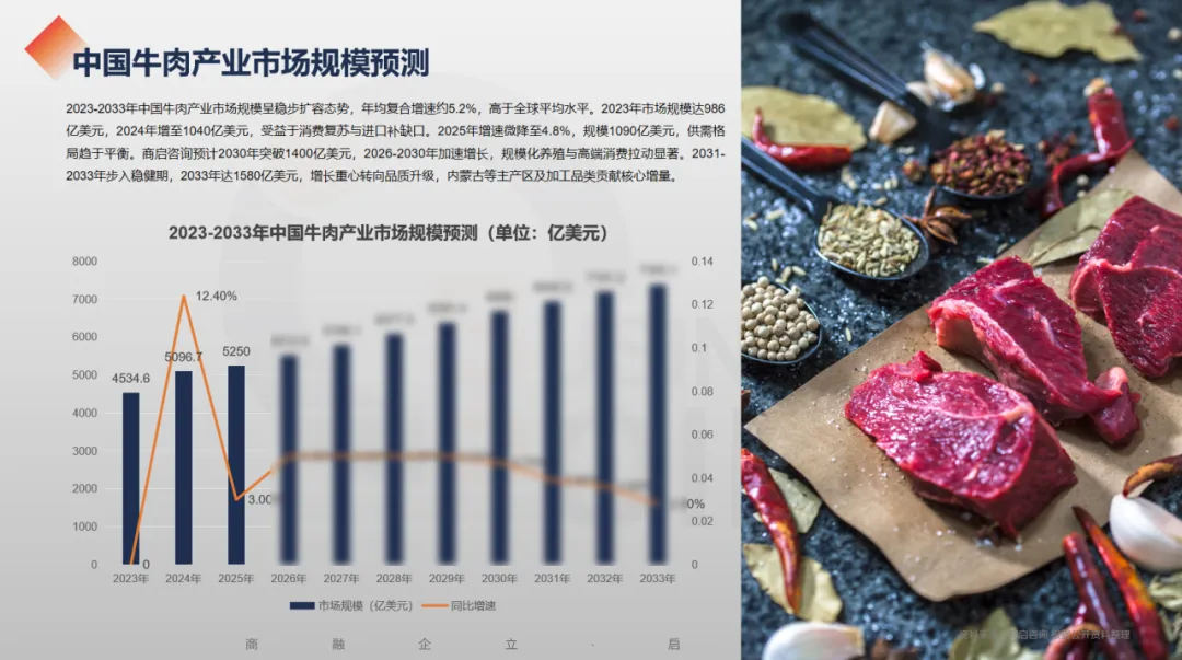 2023-2033年中国牛肉产业市场规模呈稳步扩容态势,年均复合增速约5.2%,高于全球平均水平。2023年市场规模达986亿美元,2024年增至1040亿美元,受益于消费复苏与进口补缺口。2025年增速微降至4.8%,规模1090亿美元,供需格局趋于平衡。商启咨询预计2030年突破1400亿美元,2026-2030年加速增长,规模化养殖与高端消费拉动显著。2031-2033年步入稳健期,2033年达1580亿美元,增长重心转向品质升级,内蒙古等主产区及加工品类贡献核心增量。