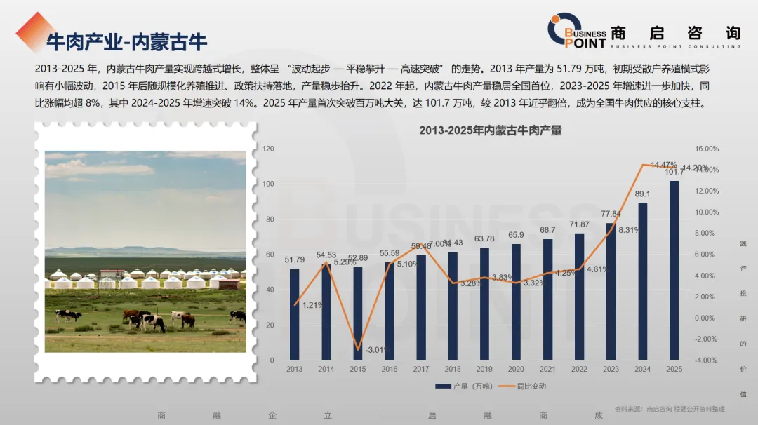 2013-2025 年,内蒙古牛肉产量实现跨越式增长,整体呈 “波动起步 — 平稳攀升 — 高速突破” 的走势。2013 年产量为 51.79 万吨,初期受散户养殖模式影响有小幅波动,2015 年后随规模化养殖推进、政策扶持落地,产量稳步抬升。2022 年起,内蒙古牛肉产量稳居全国首位,2023-2025 年增速进一步加快,同比涨幅均超 8%,其中 2024-2025 年增速突破 14%。2025 年产量首次突破百万吨大关,达 101.7 万吨,较 2013 年近乎翻倍,成为全国牛肉供应的核心支柱。