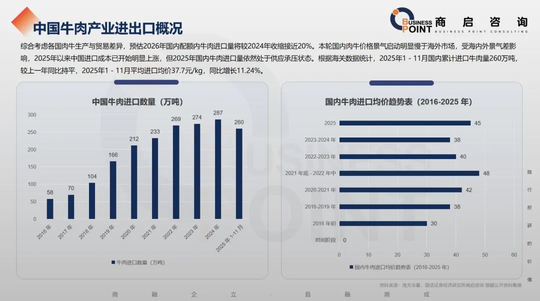 综合考虑各国肉牛生产与贸易差异,预估2026年国内配额内牛肉进口量将较2024年收缩接近20%。本轮国内肉牛价格景气启动明显慢于海外市场,受海内外景气差影响,2025年以来中国进口成本已开始明显上涨,但2025年国内牛肉进口量依然处于供应承压状态。根据海关数据统计,2025年1 - 11月国内累计进口牛肉量260万吨,较上一年同比持平,2025年1 - 11月平均进口均价37.7元/kg,同比增长11.24%。