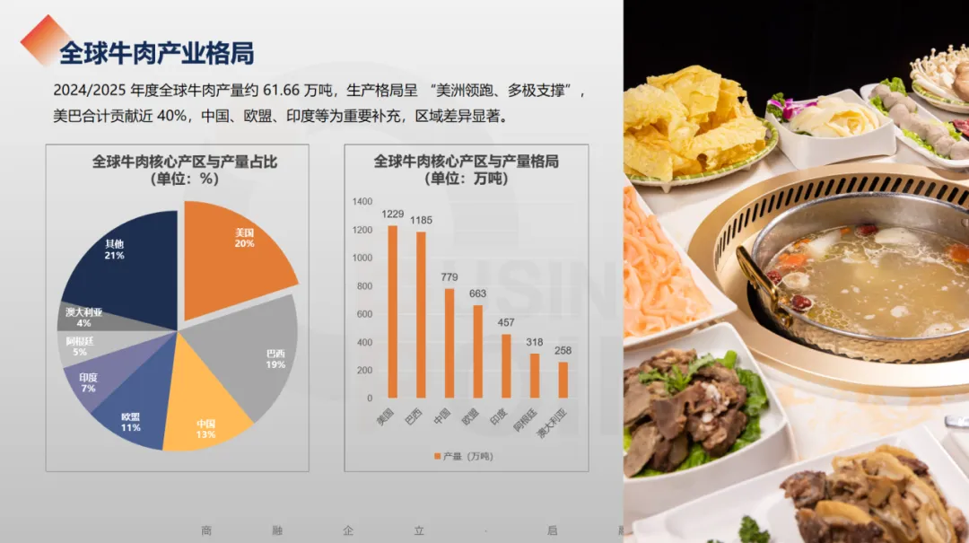 2024/2025 年度全球牛肉产量约 61.66 万吨,生产格局呈 “美洲领跑、多极支撑”,美巴合计贡献近 40%,中国、欧盟、印度等为重要补充,区域差异显著。