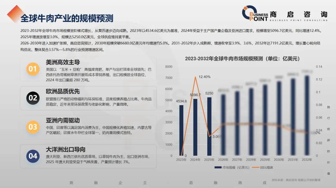2023-2032年全球牛肉市场规模呈阶梯式增长,从复苏逐步迈向成熟。2023年以4534.6亿美元为基准,2024年受益于主产国产量企稳及亚洲进口需求,规模增至5096.7亿美元,同比增速12.4%。2025年增速放缓至3.0%,规模达5250.0亿美元,全球供应维持紧平衡。