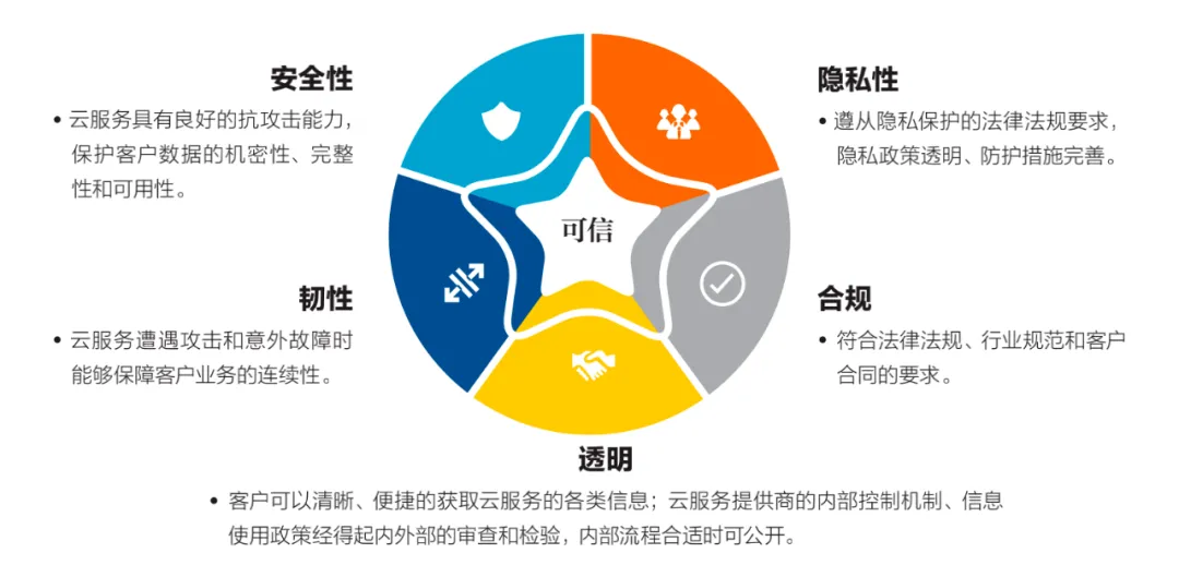 根据《华为云可信白皮书》,华为认为云服务的可信应该包括安全、隐私、合规、韧性、透明五个基本特征,提出只有依靠可信的组织实现可信的过程,才有可能打造出真正可信的产品。