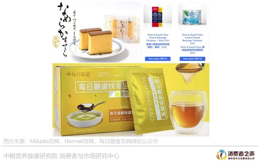 中国疾控中心与上海君石生命科学研究院于2023年—2024年合作开展了全国首次针对老年人消化功能减退的2万名60岁及以上老人的调查数据显示,该人群吞咽障碍发生率高于10%,功能性消化不良率接近14%、存在便秘问题的高于24%;老年人消化功能减退率随年龄增加而上升,特别是80岁以上的老年人,明显高于其他年龄段人群,比如,吞咽障碍发生率超过17%,有便秘问题的接近40%。吞咽障碍,这不仅影响了他们的饮食体验,增加了进食时的安全风险,还导致老年人难以摄取足够的营养,进而导致营养不良,严重影响了他们的生活质量。面对这一问题,在国际领域,日本点心品牌mikado本铺联合医疗从业者、糕点师、吞咽患者推出了一款即使是老年人也无需咀嚼即可食用的新产品——名为Namera castella的长崎蛋糕;美国的Hormel Health Labs则提供多种通过增稠剂来让食品更加易于吞咽产品(Thick & Easy)。在国内市场,部分企业也在积极探索创新解决方案。例如每日膳食刚刚进入市场的快凝宝产品,能够在不改变食材本身的味道的基础上,快速增稠,帮助老年人安全摄入所需的食物和水分。这种创新科技的应用,不仅优化了老年人的饮食体验,还为解决吞咽障碍问题提供了切实可行的路径。