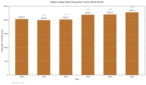 全球铜矿产量保持稳步增长态势,但增速相对温和。根据国际铜业研究组织(ICSG)数据,2024年全球矿产铜产量达到2283.5万吨,同比增长2.76%,较上年增长约56万吨。这一增速低于年初市场预期,主要原因是部分主要产铜国面临矿石品位下降、天气因素干扰以及投资不足等挑战。