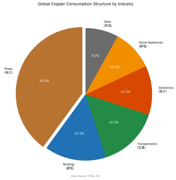 铜的下游应用领域极为广泛,主要包括电力、建筑、交通运输、电子电器、机械制造和轻工等领域。不同地区的消费结构存在差异,但电力行业始终是最大的铜消费领域。