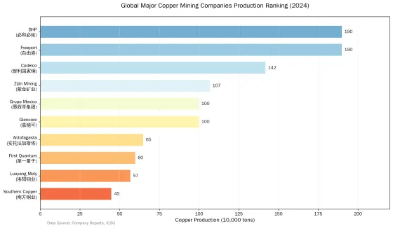 (Glencore)等跨国矿业巨头占据主导地位。2024年,全球前十六大铜矿生产商合计产铜约1354万吨,约占全球总产量的58.87%。其中,必和必拓和自由港麦克莫兰两家企业铜产量均超过190万吨,位列全球前两位;智利国家铜公司产量约为142万吨,位列第三;紫金矿业和墨西哥集团产量突破100万吨。