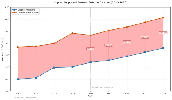 展望未来,铜行业面临前所未有的发展机遇与挑战。一方面,新能源产业(电动汽车、光伏、风电)、人工智能数据中心、电网升级改造等领域的需求快速增长,为铜消费提供强劲支撑;另一方面,矿端供应增长受限、资源枯竭压力、环保政策趋严以及地缘政治风险等因素持续制约供给增长。国际铜业研究组织(ICSG)预计,2025年全球铜矿产量约2315万吨,增长1.4%;精炼铜消费约2814.3万吨,供需缺口将达到约500万吨,2026年缺口将进一步扩大。在此背景下,铜价中长期趋势预计将维持上行格局。