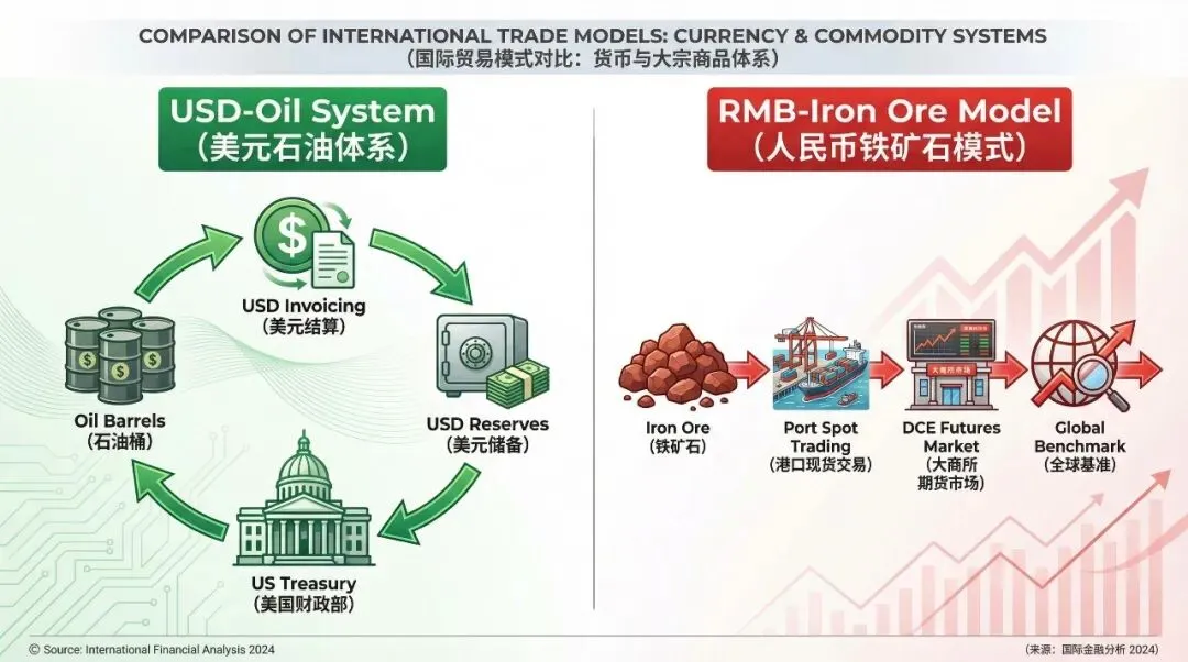 图2:美元-石油闭环体系与人民币-铁矿石演进模式对比