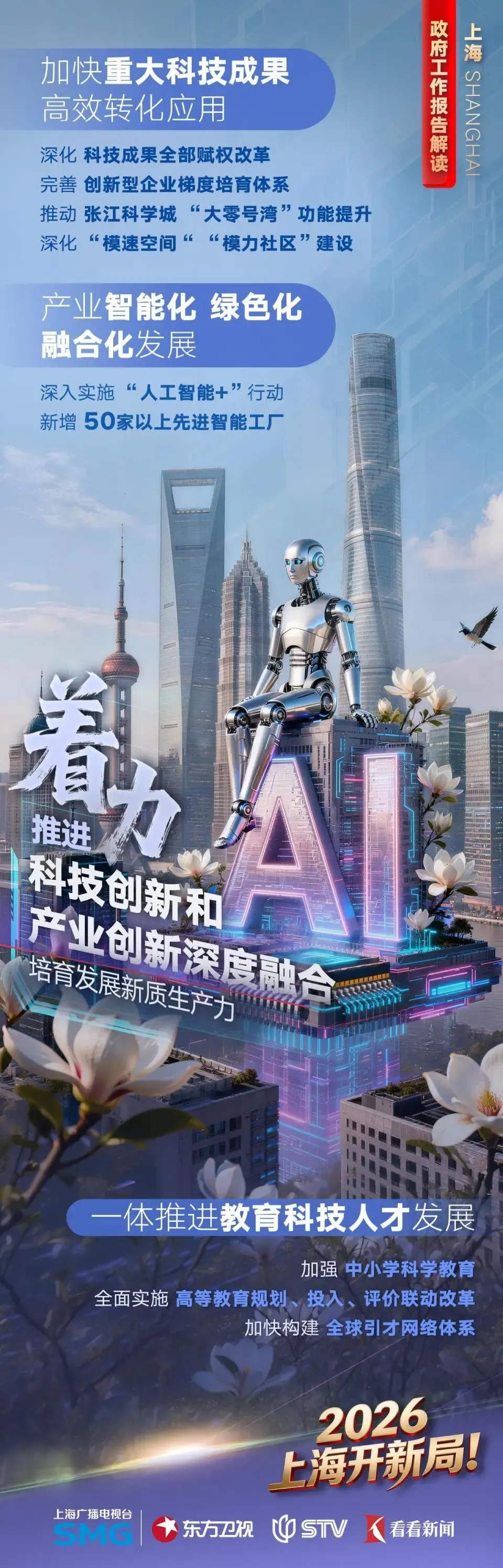 加快人工智能等数智技术创新。完善“硬设施”和“软平台”,深化数算电网等资源协同,发展智算、超算等先进算力中心,聚力突破AI芯片和大模型等关键技术,建设高质量数据集和开源社区,培育一批重点行业智能体和智能原生企业,大力发展人工智能终端,支持人工智能OPC创新创业,让“单人成军”蔚然成林。深化拓展“人工智能+”,出台人工智能赋能科学研究实施方案,高水平建设国家人工智能创新应用先导区,推动中国科学院工业人工智能研究所形成建制化能力,丰富高价值应用场景,打造智能经济新形态。