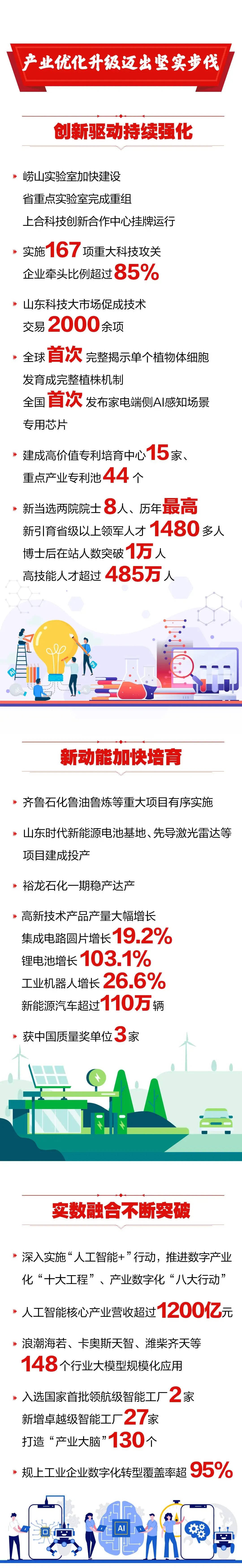 大力发展数字经济。建设省级数字经济创新发展试验区,推进实数融合促进行动。开展人工智能“双百工程”,培育100家以上特色企业和100个以上行业级、场景级大模型和智能体,争创工业软件、家居家电国家人工智能应用中试基地。推动出台数据条例,建好国家数据要素综合试验区,培育10个以上省级数据产业集群,打造10个以上行业高质量数据集。梯次布局一批智算资源池、可信数据空间,加快建设中国算谷·人工智能公共服务平台,建好济南、青岛、枣庄算力枢纽。 建设小麦人工智能育种平台,培育智慧农业场景100个。