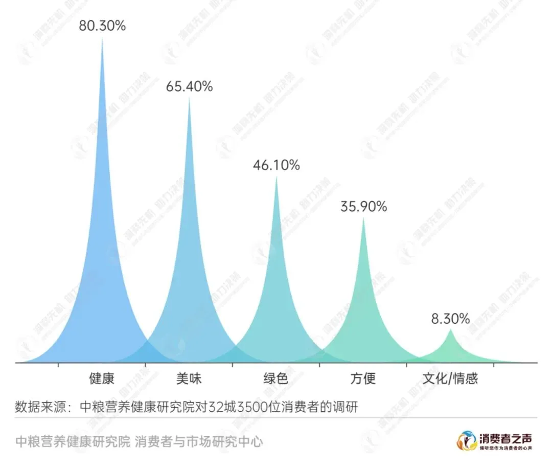 理性与感性的交织,构成了当下人们对于食品的消费意愿。一方面有理性的重塑,消费者展露了对平衡务实的关注,另一方面则是感性体验,回归自我体验与心价比需求,这种复杂态度使2023年的食品市场不断涌现出新的增长点。食品需求的另一个变数在于“健康”。我们在调研中发现,消费者的健康意识出现了显著提高,80%的消费者在购买食品时会着重考虑健康因素,健康因素的重要性明显超过了美味,这使2023的食品市场相比往年出现了显著差异。